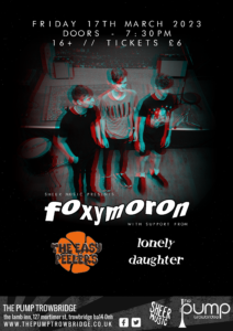 A bill of the freshest, newest, most exciting indie, alt & rock bands doing the local circuit.Foxymoron are fresh form their Take The Stage shows in Chippenham, The Easy Peelers are Bath College/Uni students whose frontman is Troiwbridge born & bred. Whilst Lonely Daughter come from Bristol way and cement the new scene that is developing in Trowbridge!